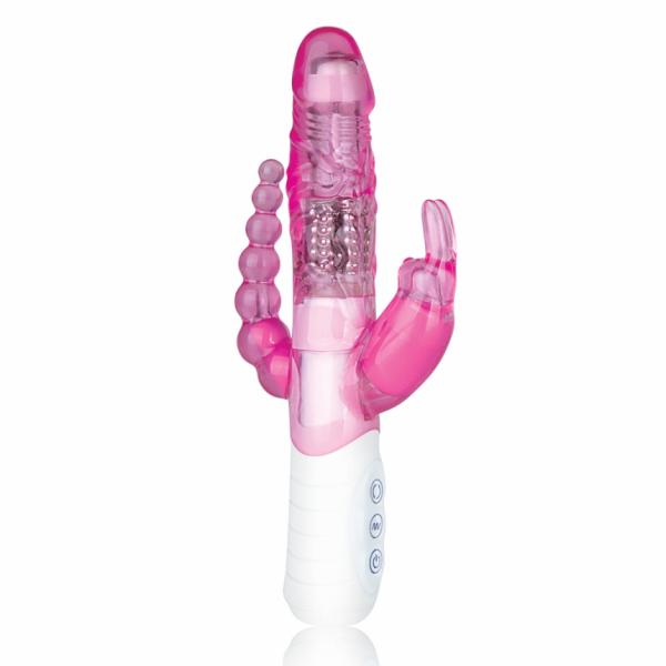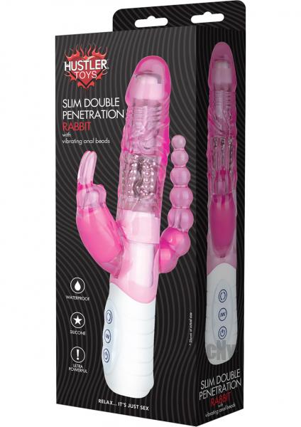 The Slim Double Penetration Rabbit from Hustler Toys makes your desire for extreme erotic play a reality. Experience double penetration with your pleasure as the ultimate goal. The Slim Double Penetration Rabbit simultaneously provides anal and clitoral pleasure, while the rotating shaft stimulates the G-spot. Experience an intense orgasm with this three in one pleasure tool. The smooth contoured head of this unique rabbit provides a realistic sensation as the three speed rotating shaft swirls, creating delicious friction that will have your quivering with pleasure. The seven function vibrating rabbit hugs the clitoris and surrounds it with pulsating stimulation. The powerful vibrating bullet in the attached anal beads buzzes to bring you unrivaled anal stimulation. The graduated beads make this toy perfect even for anal play beginners. Featuring an easy to use control with LED, each vibrating motor can be controlled independently, allowing you to experience optimal pleasure. The Slim Double Penetration Rabbit is waterproof for erotic solo or couples play in the shower