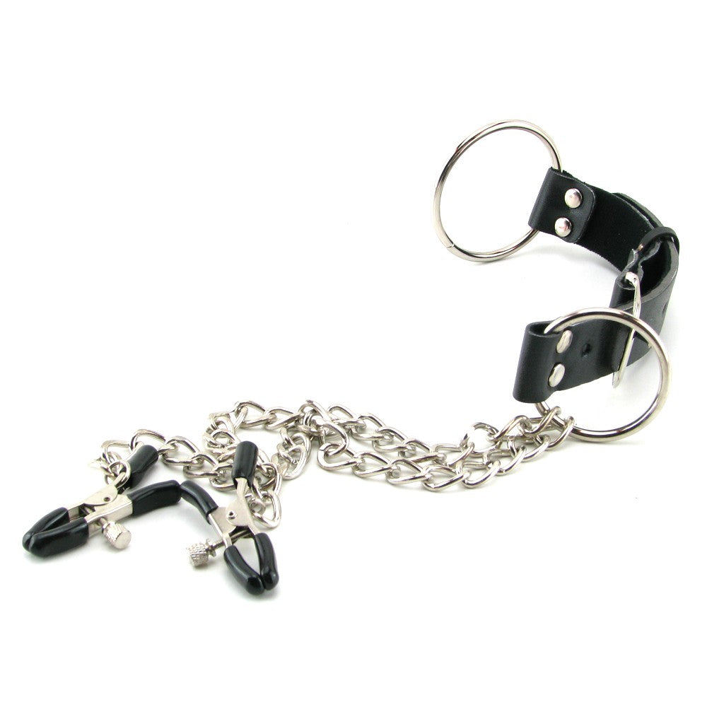 The clamps themselves are classically styled with an alligator shape that features completely adjustable tension. They're weighted by hardy metal chains that connect to a sturdy O-ring, which in turn connects to a sexy leather-look height strap and metal cock ring. Fits most.